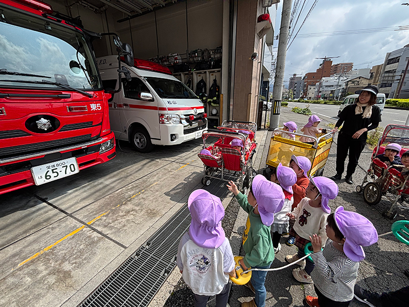 新しい生活にも慣れ、 毎日笑顔と元気な声があふれています 登園すると、『今日はどこに行く?』『公園に行きたいなぁ〜』と子どもたち 天気が良い日には、公園や消防署、アーケード街… 色々な場所へお散歩に出かけます。 遊具を使って身体を動かしたり、大好きなはたらく車を見たりして、 園外活動を楽しんでいます。さて、今日はどこに行こうかなぁ