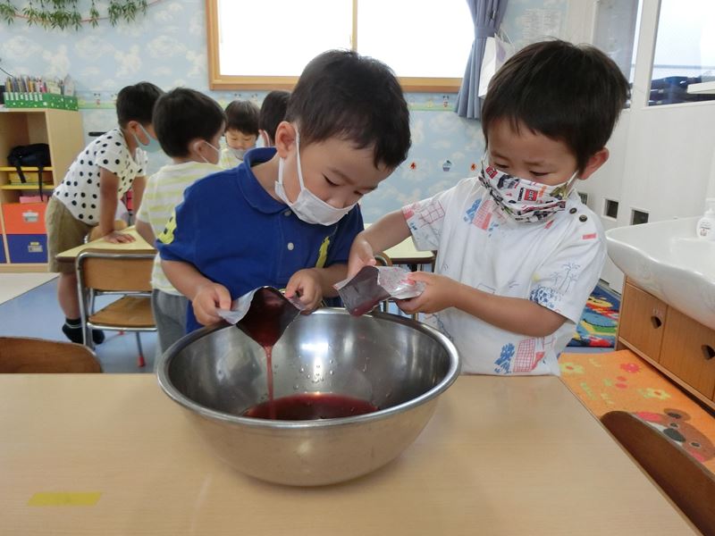 ぱんだ組がフルーチェ作り、ミニトマトのへたとりに挑戦しました。
