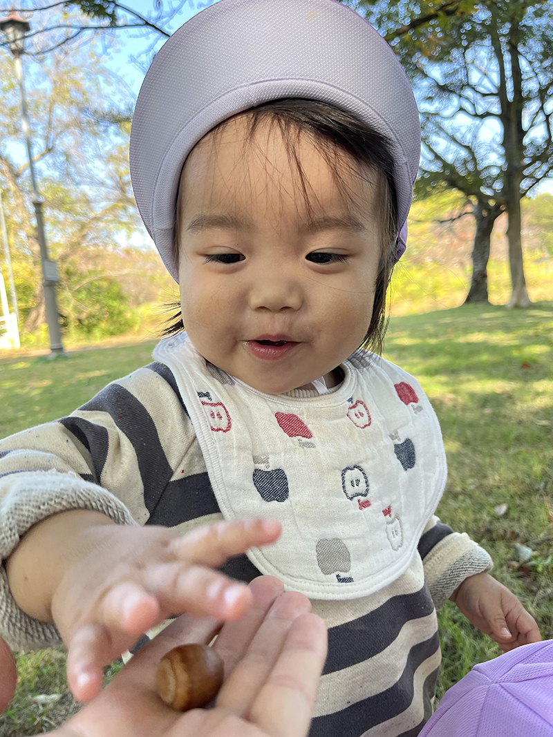 秋を探しに、お散歩にもたくさん出かけました。 銀杏並木のしたには、一面の黄色いふかふかじゅうたん 落ち葉の上を歩くと、カサカサカサ…なんだか楽しい音がするよ〜! と大発見したこどもたち! 何度も何度も、足を踏み鳴らしていました ひらひら〜っと舞う落ち葉を追いかけたり、 どんぐりを拾ったり… 秋の公園には宝物がいっぱいでした