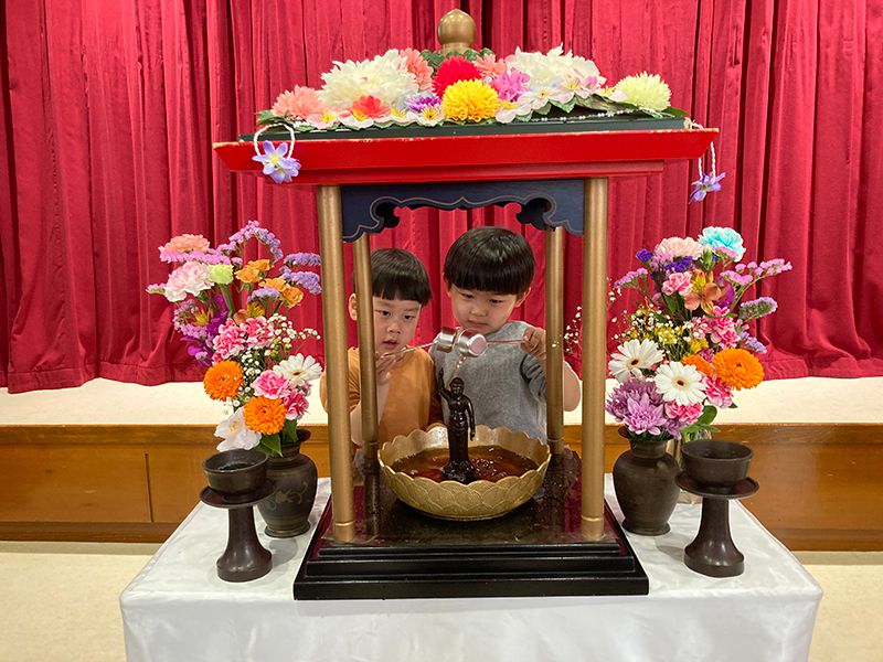 4月8日は、お釈迦さまのお誕生をお祝いする「花まつり」の日です。 お釈迦様は、およそ2500年前、ルンビニの花園でお生まれになりました。 今年も子ども達が綺麗なお花を持ってきてくれて 花御堂も園内も華やかになりました。 年長児が憧れの稚児衣装を着て献灯献花を行い、 みんなでお釈迦さまに甘茶をそそいでお祝いをしました。 おやつの時間には甘茶を飲みました。 「甘い!」「何か苦い…」と さまざまな思いを言いながら楽しく飲んでいました。 これからもお釈迦さまに見守られながら 元気に過ごしていきましょうね。