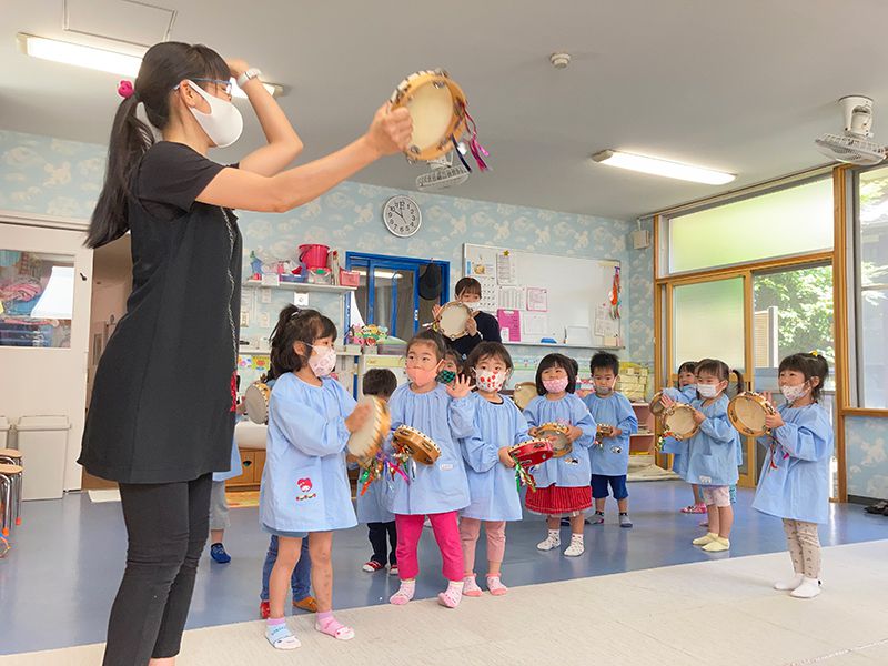 くま組(年中)は、音楽に合わせてさまざまな楽器を鳴らしてみたり、