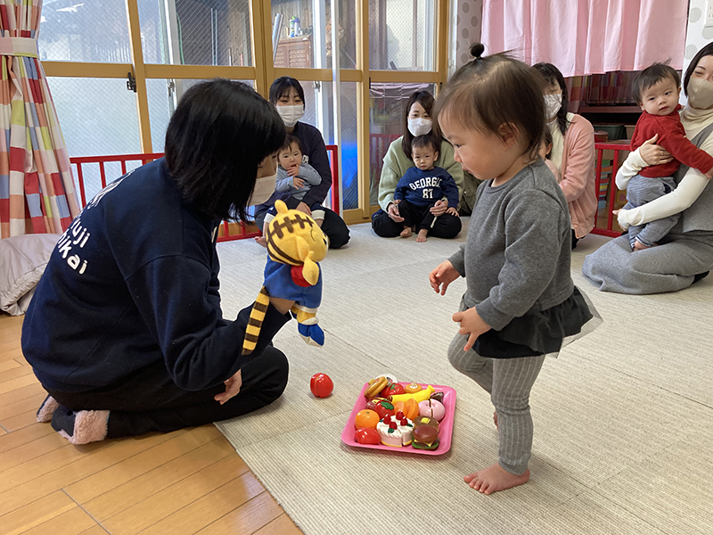 大型絵本や手遊び、スキンシップ遊びを楽しんでもらいました。