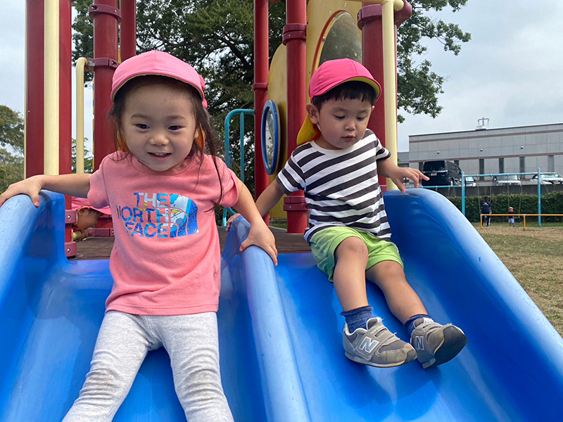 毎日元気いっぱい過ごしているこあら組 園庭で運動会の練習をしている大きな子の真似をして 「よ〜いどん。」の掛け声とともに園庭を走り回ったり、 友達と砂場で山づくりやおままごとをしたり、のびのびと遊んでいます。 室内では、簡単なルールを少しずつ理解しながら、 椅子取りゲームや玉入れなどに夢中になっています。 友達と“一緒”に遊ぶ楽しさを感じながらみんなすくすく成長中です! これからの成長も楽しみです