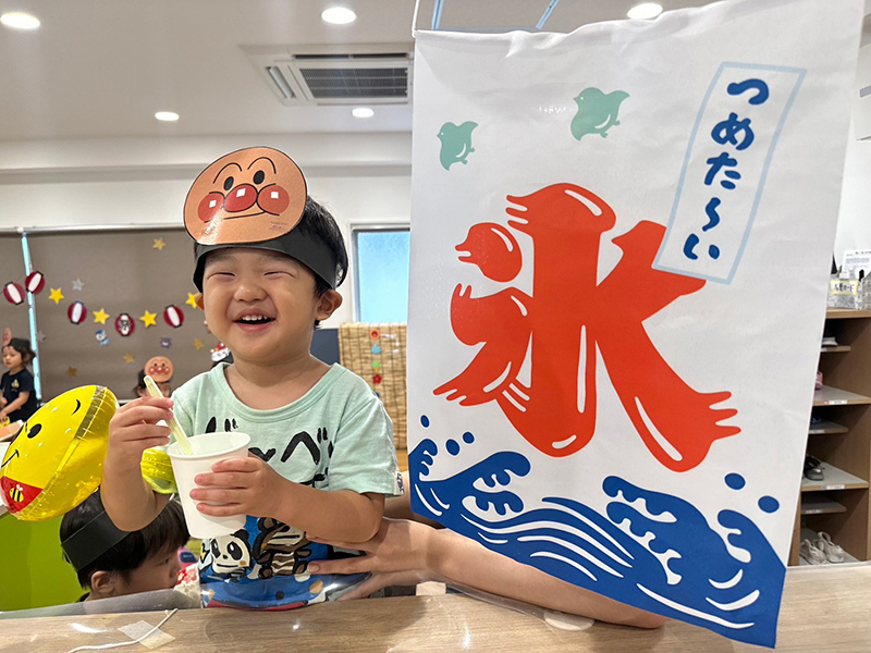 今月は楽しみにしていたイベント、七夕夏まつり 笹の葉に飾りつけをし、お願いごともつるしました さぁ、夏祭りのスタートです 大好きなキャラクターお面に、車を走らせポケモンゲーム! ウキウキお菓子の千本引きに、最後は冷たいかき氷!! 何味にしようかな〜と悩む先生をよそに、 いちご!メロン!!と子どもたちの決断力のある事(笑) 最後は空っぽになったカップを、 いつまでも握りしめていました